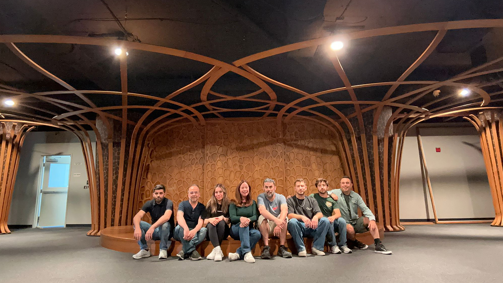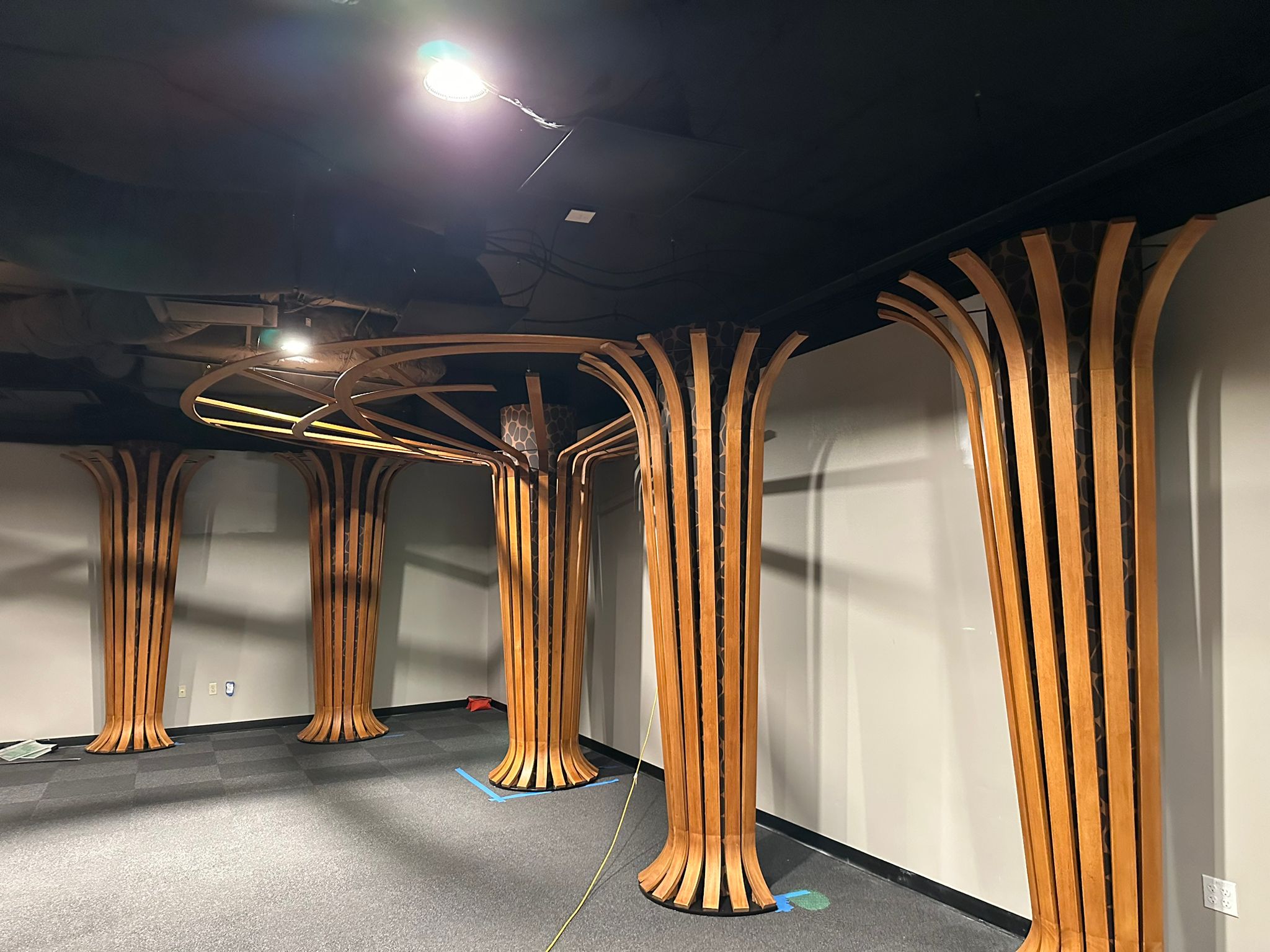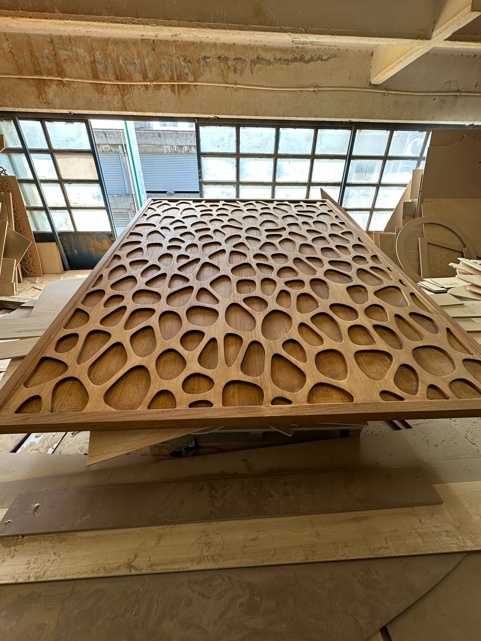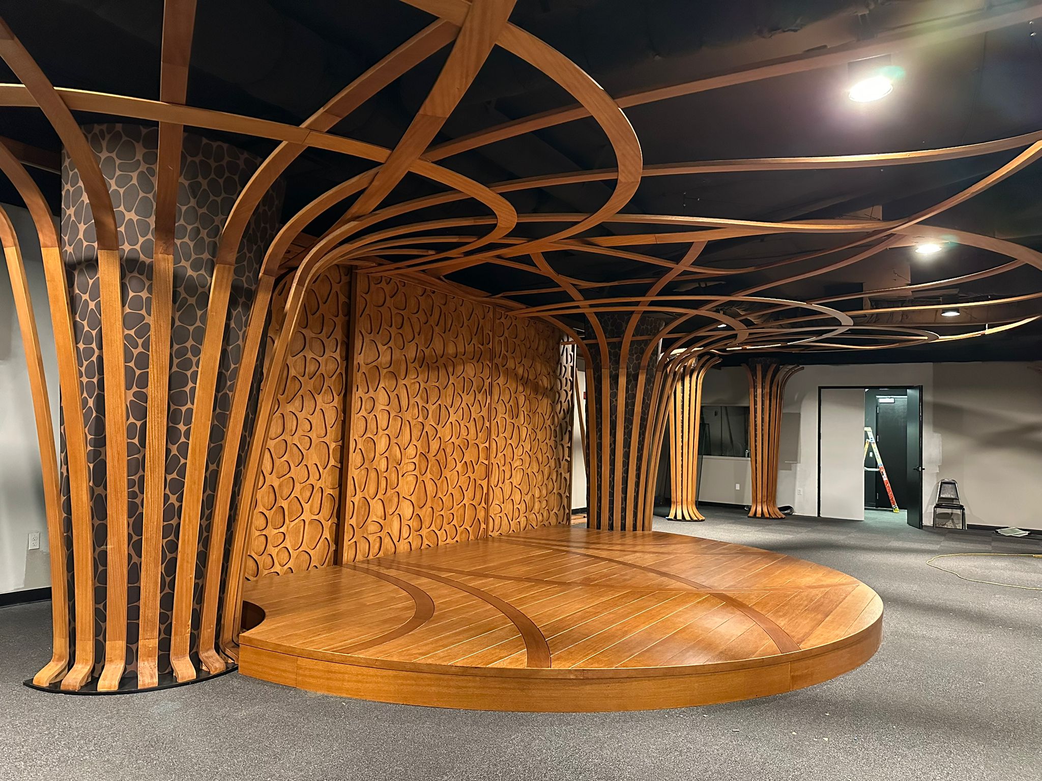 5-axis CNC routers were used to shape the wooden panels and structural columns, which were then assembled using wood lamination techniques to achieve durable and elegant forms. -