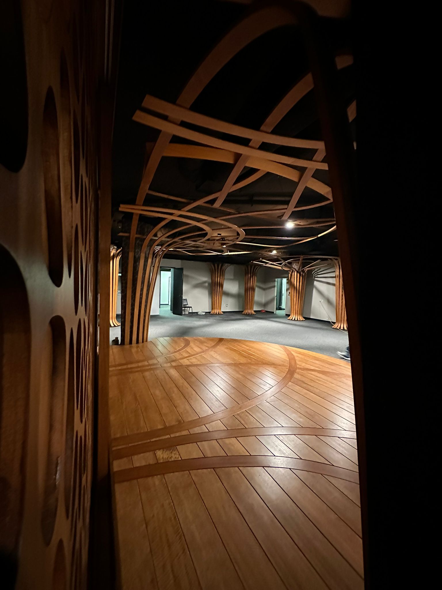 A central, circular performance stage featuring custom inlay patterns in different wood tones, designed as the focal point for live performances. -