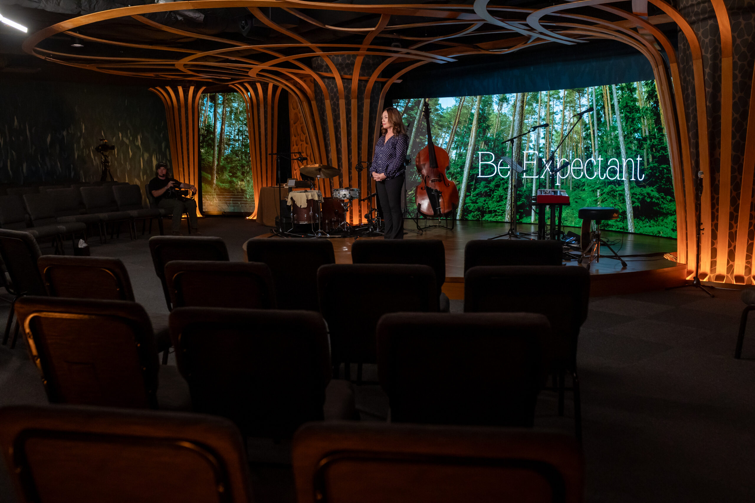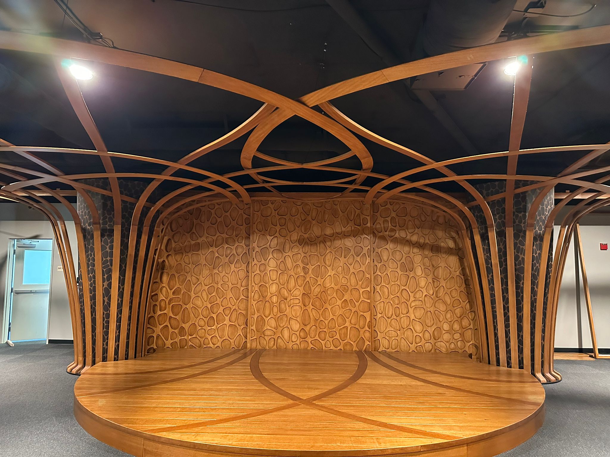 A three-dimensional wooden wall cladding reminiscent of river stones was crafted with advanced CNC techniques, adding depth and a natural rhythm behind the stage. -